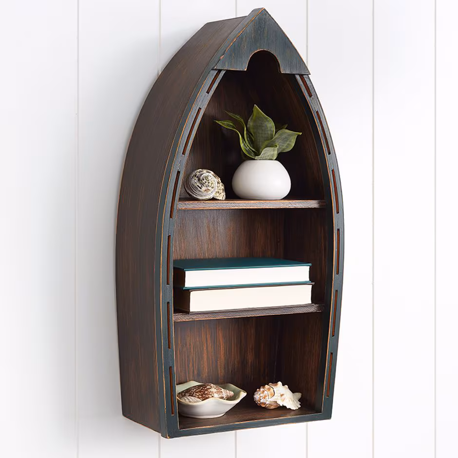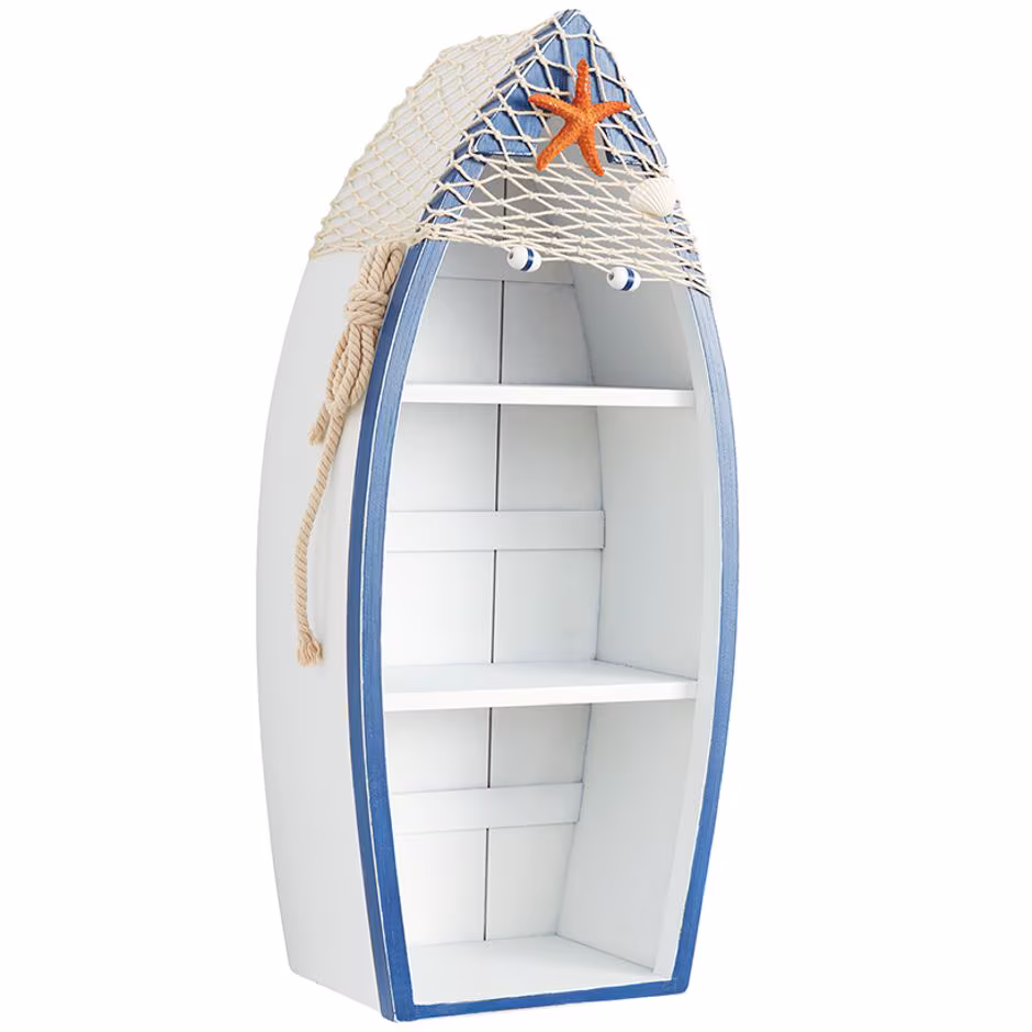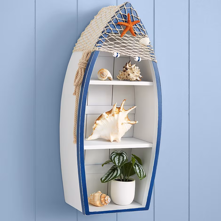 Give your home decor a coastal touch with the Canoe Wall Decor! Versatile piece brings beach charm and lake character to any room. With its thoughtfully designed shelves, you can showcase your favorite collectibles, create a mini-library, or organize small essentials effortlessly. Choose from White/Blue and Natural/Green. The White/Blue option adds a nautical touch with decorative accents like netting, starfish, and a rope float. Natural/Green offers a sleek and understated look for a warm, organic vibe. Lightweight yet sturdy room decor comes with a triangle hook for simple hanging, or set it on a table.