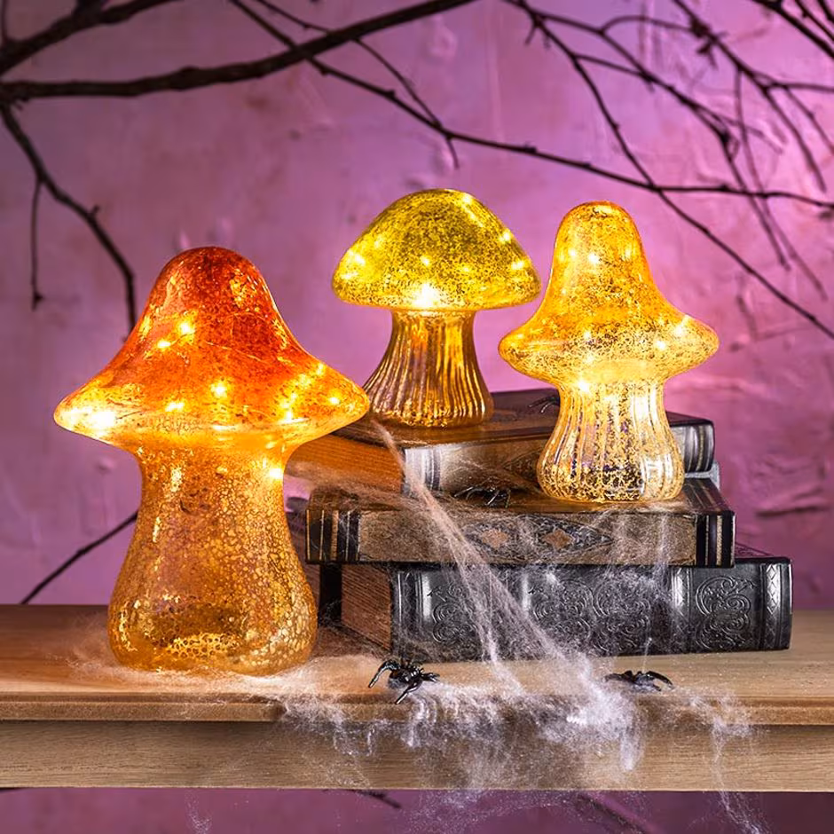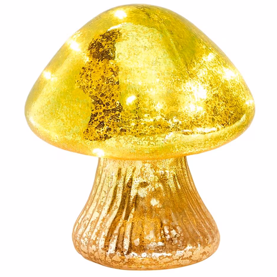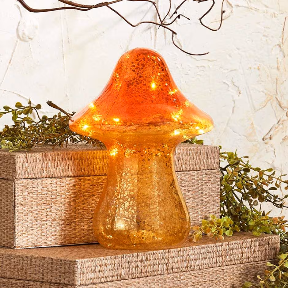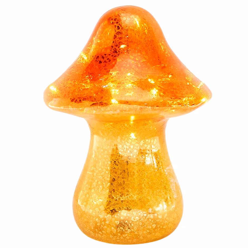 Handmade Lighted Glass Mushrooms bring cottagecore sparkle to your home or office. Display them almost anywhere for some unexpected color and light. Warm LEDs brighten a dresser, desk, countertop or shelf. They make sweet paperweights and gifts, too.